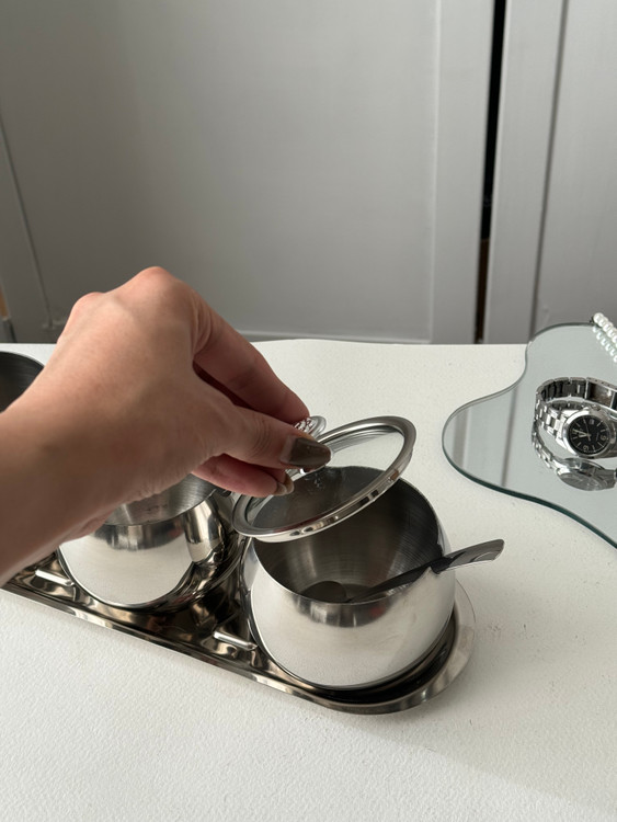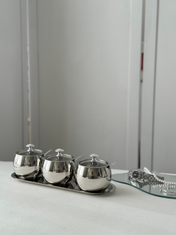 شامل سه کاسه با درب و قاشق استیل به همراه یک سینی استیل زیر کاسهها