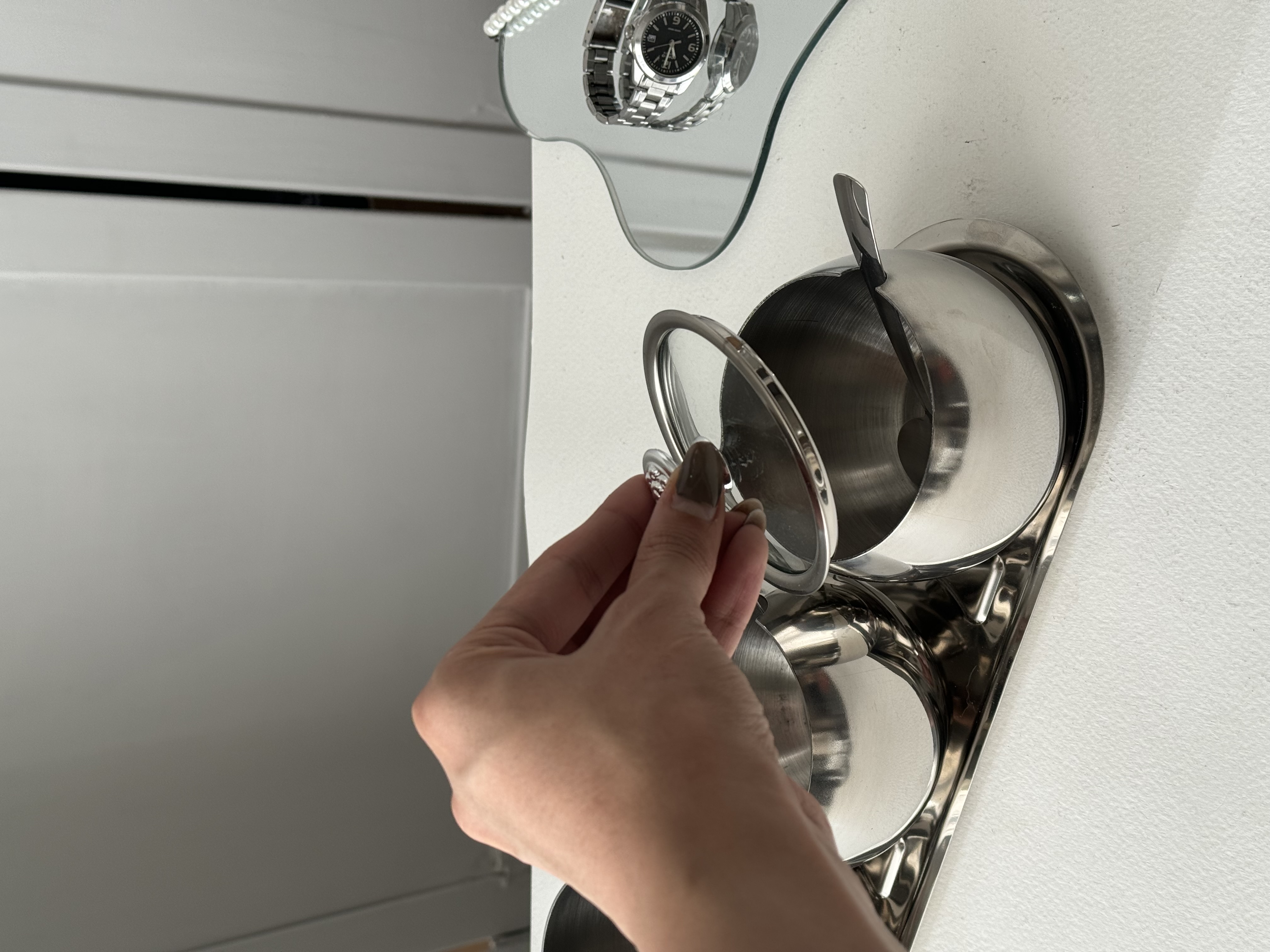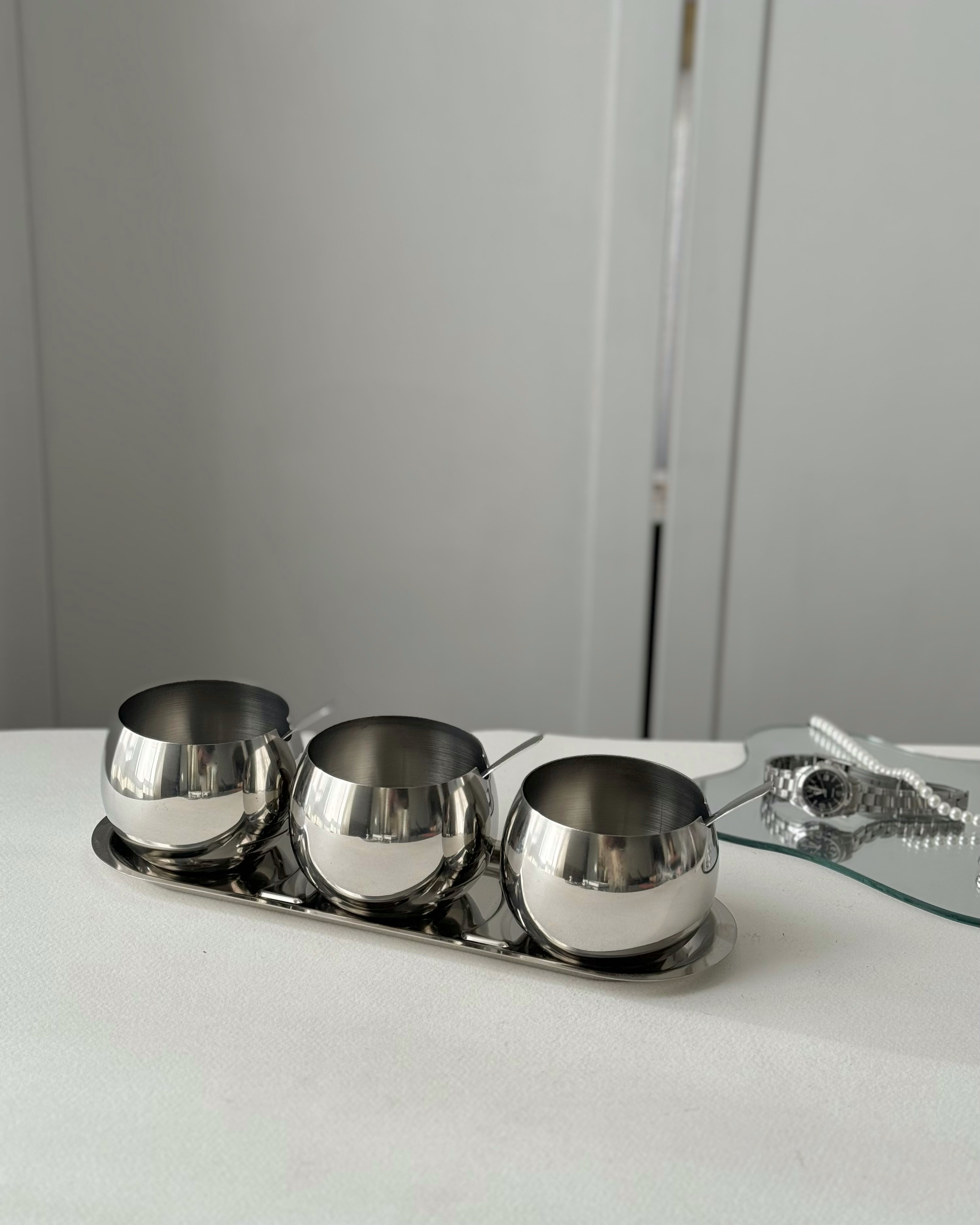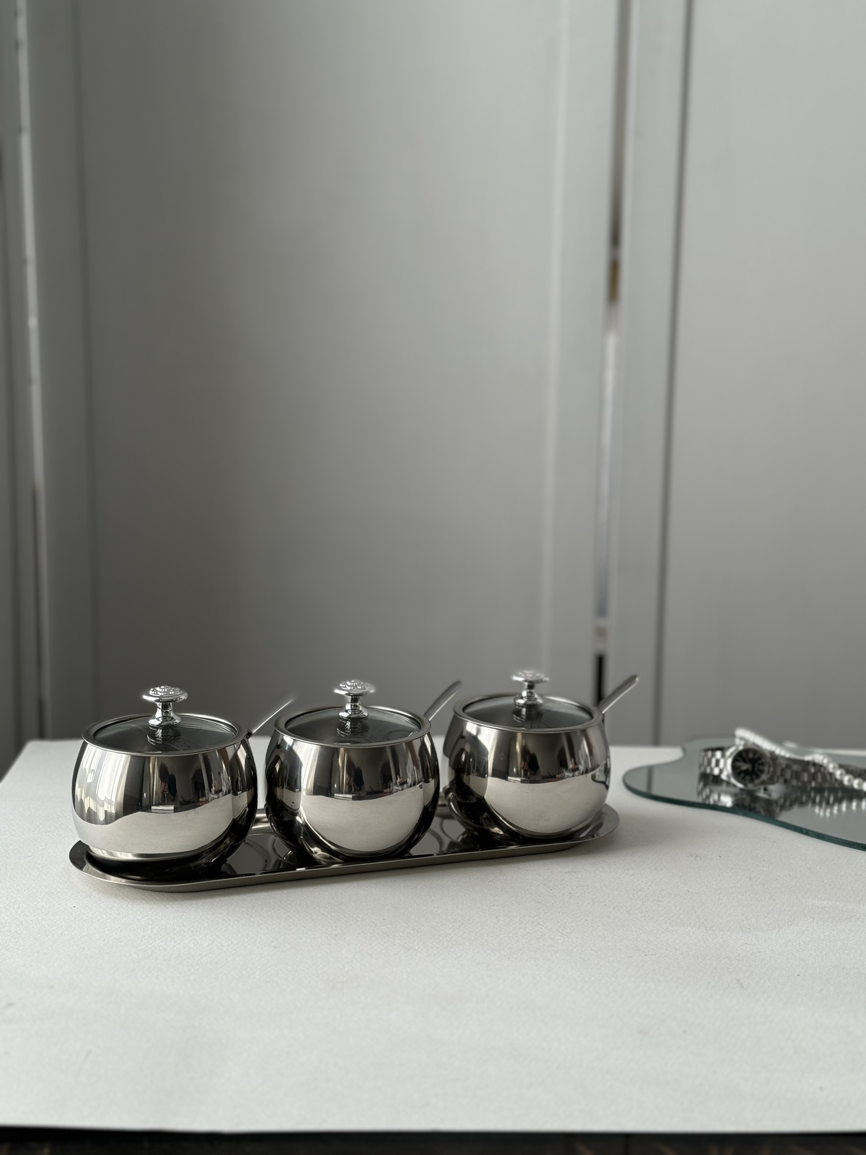 شامل سه کاسه با درب و قاشق استیل به همراه یک سینی استیل زیر کاسهها